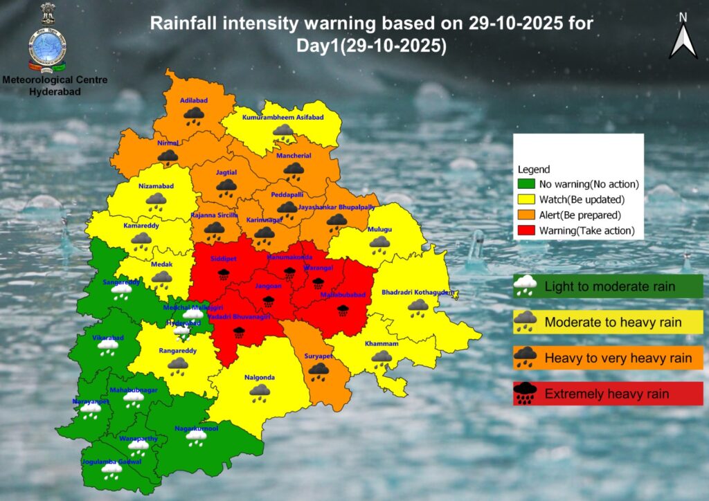 హన్మకొండ, వరంగల్, మహబూబ్ బాద్, జనగాం, సిద్దిపేట, యాదాద్రి భువనగిరి జిల్లాలకు వాతావరణ శాఖ రెడ్ అలర్ట్ జారీ చేసింది. ఈ జిల్లాల్లో 20 సెంటీమీటర్లకు పైగా వర్షపాతం నమోదు కావచ్చని అధికారులు హెచ్చరిస్తున్నారు. ప్రజలు అవసరమైతే తప్ప బయటకు వెళ్లవద్దని, నదులు, వాగులు, చెరువుల సమీప ప్రాంతాల్లో జాగ్రత్తలు తీసుకోవాలని సూచించారు.